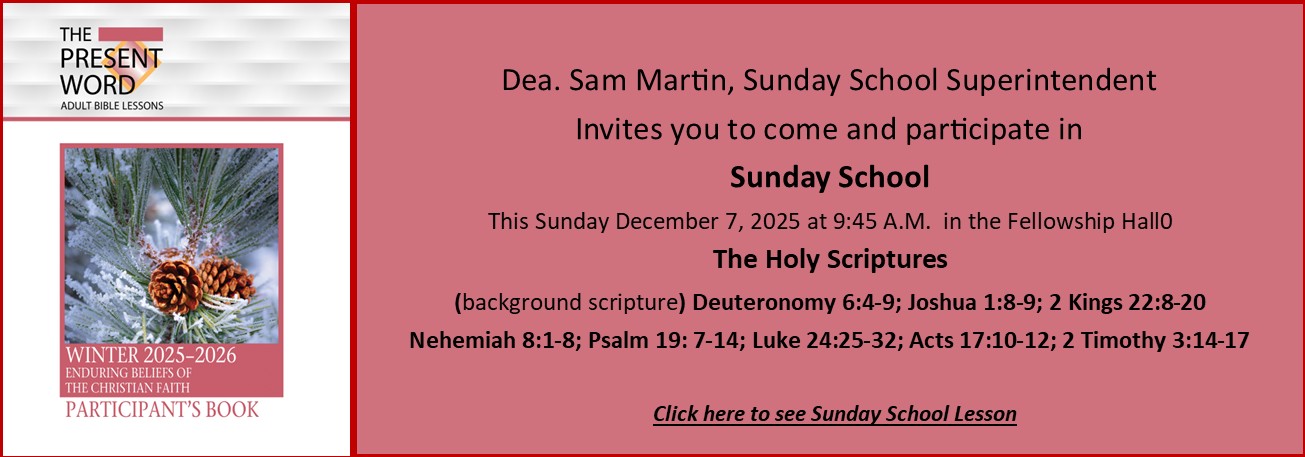 The purpose of our Sunday School is to provide a forum for discussing, interpreting, understanding, and applying the scriptures. We promote Christian values according to scriptures.